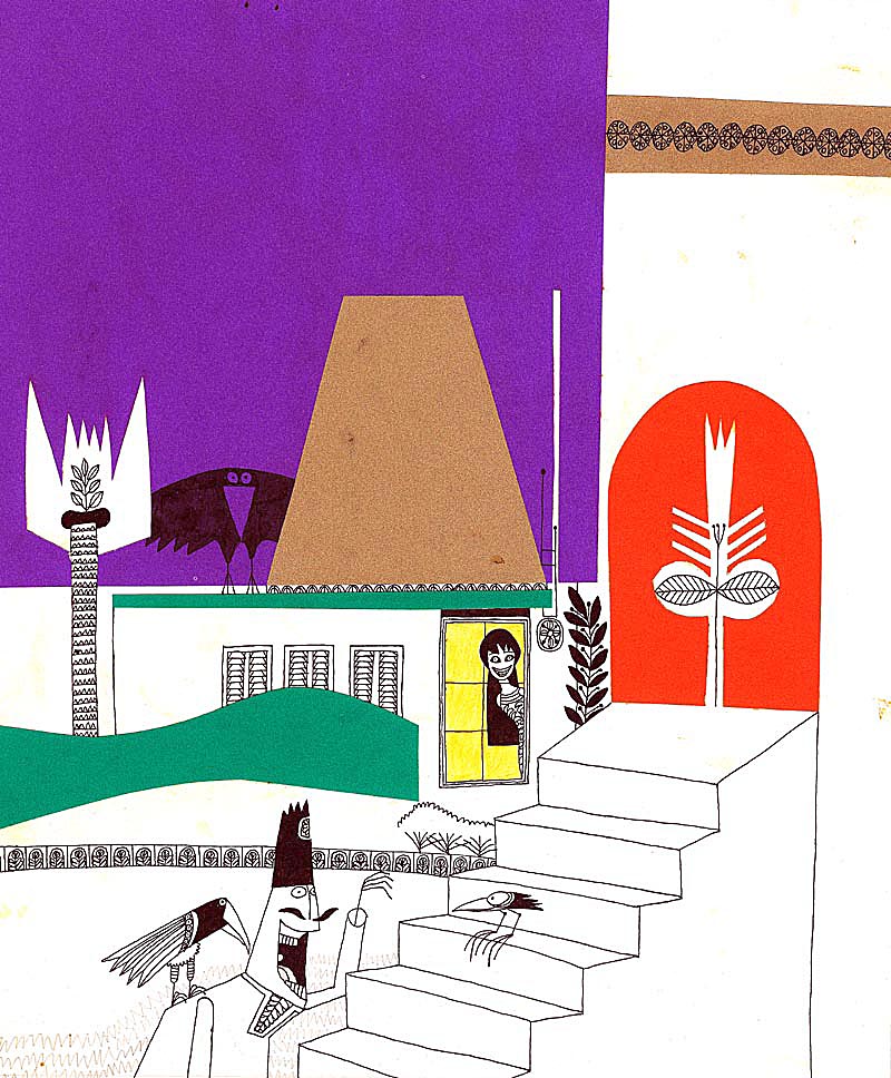 | サイズも指定してありますし、トンボも切ってあります。ベタ部分の空き具合など見ると、恐らくそこにタイトルなど入れるスペースとして空けてあるというのがアリアリですから、雑誌類の表紙(サントリーの社内誌「まご」に少々雰囲気が似てます)か、何かの仕事で描いたものではないか?とも思うのですが…トレペも貼っておらず、納品した形跡が見られません。妙ちくりんなホラー調でボツになってしまったものか?尚、ホラー調女がいる窓の黄色意外の色ベタ部分は、塗ったものではなく、色画用紙(それも文房具屋さんで売っているような安モンです)を切って貼ったものです。それにしても、何とも不思議なムードのある絵です…。 |
