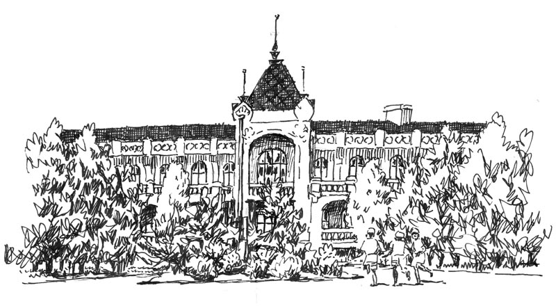平成12年、旅順師範付属小学校の同窓会である霊玉会の「火鍋子(ホーコーズ/中国の鍋料理)を囲む会」の案内に使われたポイントカット。旅順師範付属小学校の外観です。