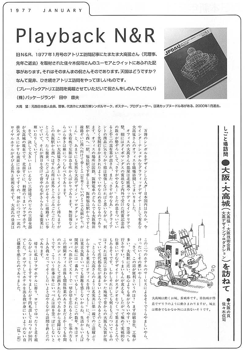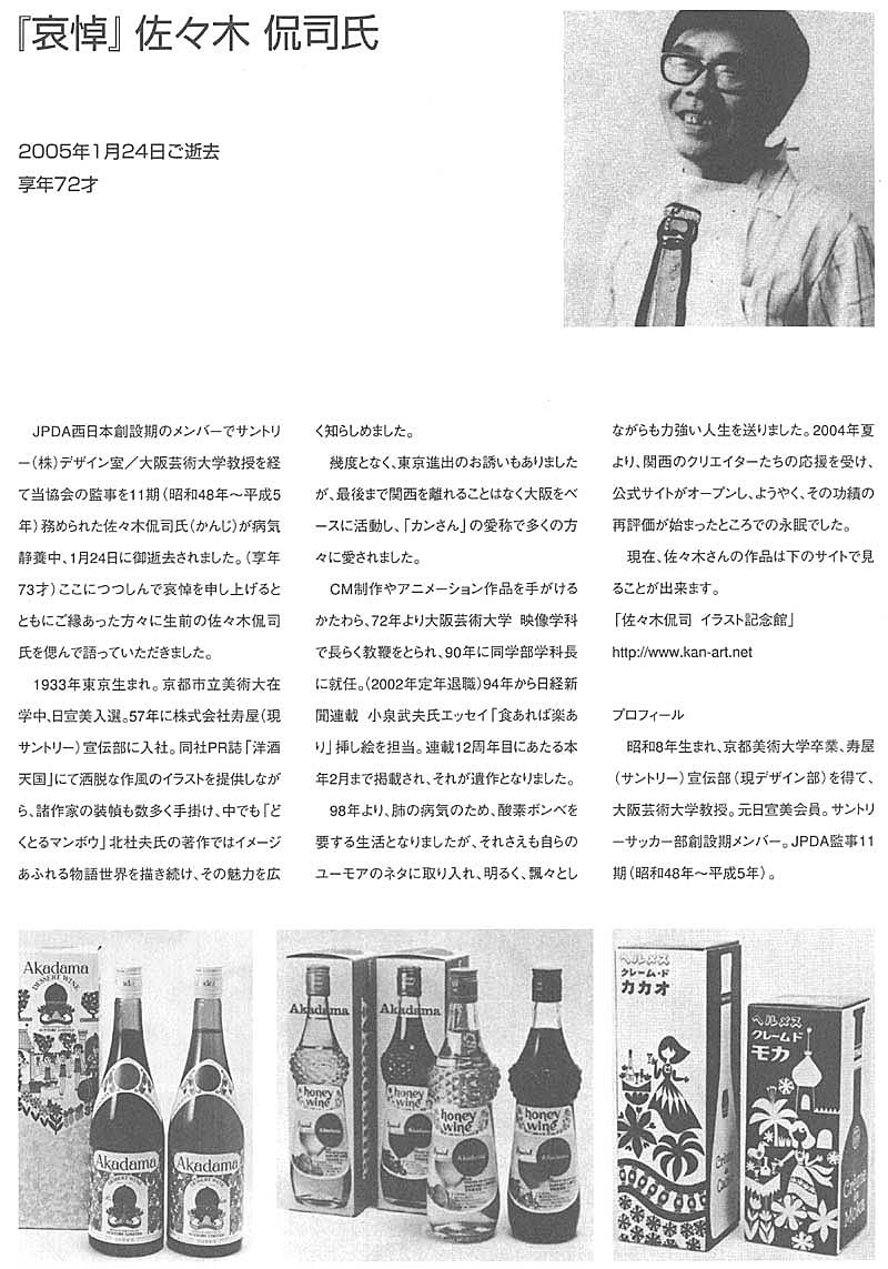 | 日本パッケージデザイン協会の会報誌「N&R(News And Report)」にカンさんの追悼記事が掲載されました。カンさん自身も同協会の創設期からのメンバーで、昭和48年から平成5年まで監事も務めました。追悼特集は、下の2ページに加え、元・サントリーデザイン室/室長・大森重志さん、元・サントリーデザイン部/部長・大門敏彦さんによる追悼文、そしてカンさんが同協会の理事時代に同誌の企画「アトリエ訪問」で大高猛さんを取材した際の楽しい記事も再掲載され、実に5ページにも及びました。編集に携わってくださった皆さん、本当にありがとうございました。 |