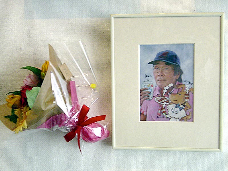 | ●入ってスグの所、珍しいアクリル絵の具作品です。 | ●遺影は、中森コーコさんの手により、サマールックに変身。 |