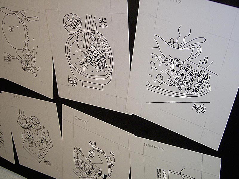 | ●「食あれば楽あり」の原画が貼り付けられた6枚の大型ボードが並びます。 | ●一部拡大。ラッキョのコーラス隊が人気者。 |