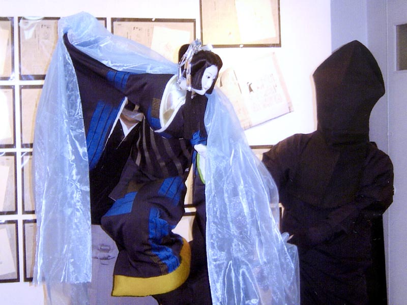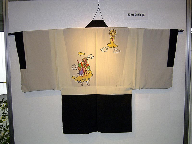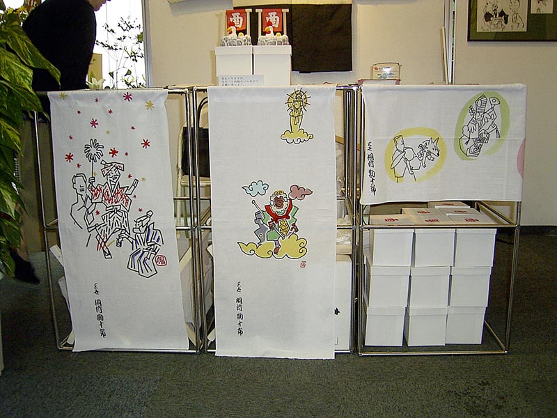 | ●三世・桐竹勘十郎襲名記念の羽織裏です。イラストはカンさんです。 | ●売店コーナー。勘十郎さんのオリジナル手拭いやカンさんの絵葉書などが販売されておりました。 |