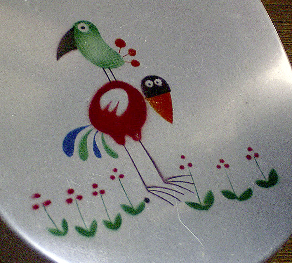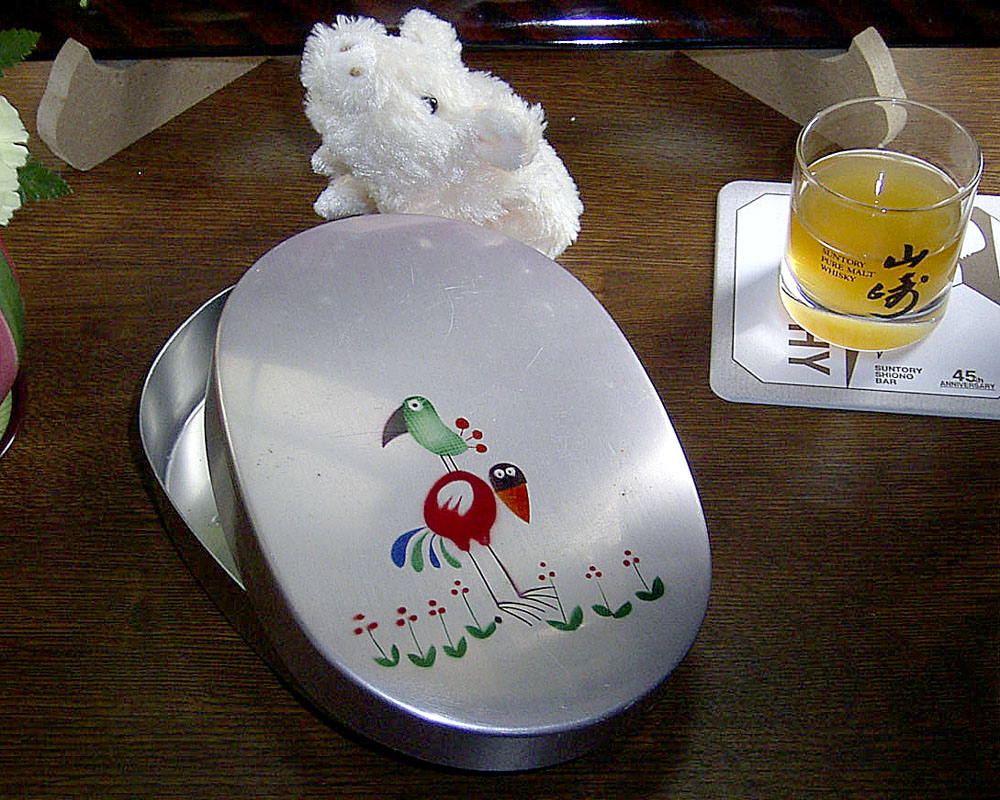 謎の弁当箱 ご覧の通り、昔なつかしいアルマイトの弁当箱です。ちょっと小ぶりサイズです。何かのプレミアムグッズなのか?一般に販売された商品なのか?サッパリ分かりません。家族で“使い倒し”ました。おかげで色も少し(ダイブ?)飛んでます。70年代は、この弁当箱以外にも文具品や日用品…「カンさんキャラ」を使った商品が多数、市場に出回りました。そう言えばインスタント焼そばのパッケージもありましたネ。佐々木家は、各メーカーから送られて来た、それらの製品を記念に置いておくということはせず「コレちょうどエぇわ」と、しっかり日常使用しておりまして、殆ど残っておりません。Tシャツなんかノビノビです。さきの焼そばも全部食べちゃいました。何か見つかれば又ご紹介いたしますネ。 |