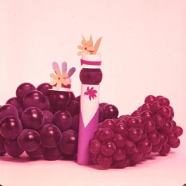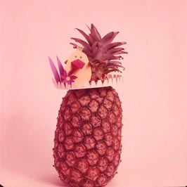 ●元の写真です。「オヤッ」と思われる方もあるかもしれませんが、撮影段階では“顔”は出来上がっておりません。この写真をベースに[デザイン→版下→色指定→製版]の行程を経て、あの果物キャラクターは出来上がります。逆に言えば、この撮影段階で、最終仕上がり(目や口の位置や、完成後のイメージ)を頭の中に描いておく必要があります。 |