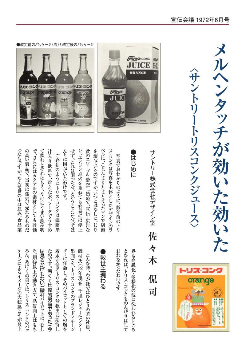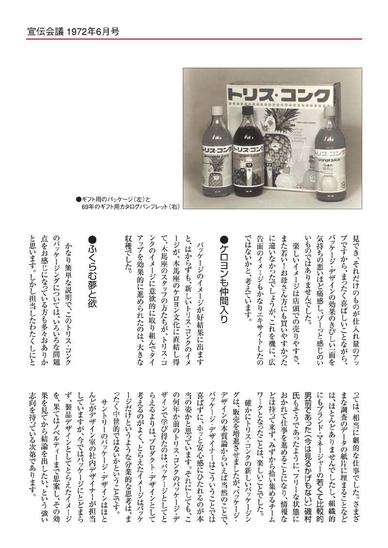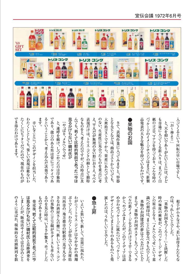 | ●このカンさんデザインのキャラクター&イラストによるパッケージ・ラベルは昭和51年(1976年)までの約8年間、起用され続けました。そして昭和51年春に、後輩の伊藤さんに、その仕事が受け継がれ、さらに昭和58年に、その後輩・加藤さんに受け継がれました。 | |