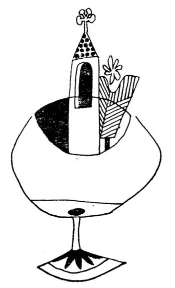 「洋酒とカクテル」に掲載された、挿し絵をご紹介いたします。何ぶん古いもので、原画もいっさい残ってはおりませんので、少々ご覧になりにくいかもしれません。しかし、初期のころのカンさんの特徴である、よりグラフィカルなタッチが存分にお楽しみいただけると思います。